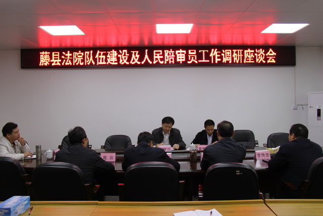 2016年12月13日,梧州市中院党组成员、政治部主任韦智远、政治部副主任黄朝东一行,到藤县法院调研该院队伍建设及人民陪审员工作情况。藤县法院党组书记、院长石忠贵、政工科科长罗传忠等人参加座谈会。