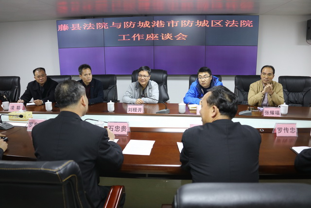 3月4日,防城港市防城区法院党组书记、院长刘柽开一行6人到藤县法院,就执行指挥中心建设、诉讼服务中心建设和司法体制改革的案件繁简分流等方面工作开展交流座谈。藤县法院党组书记、院长石忠贵和中层正职14人一起参加座谈。
