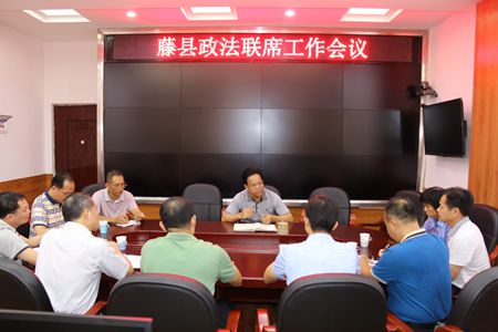 9月13日,藤县召开政法联席工作会议,出席会议的有县委常委、政法委书记,副县长、公安局局长彭军,法院石忠贵院长以及政法各部门领导。