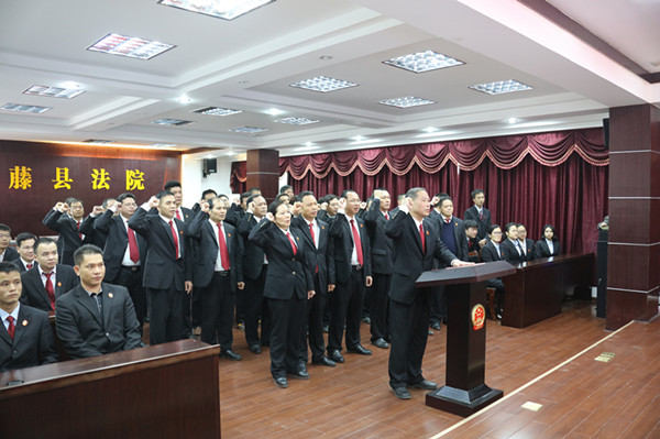 藤县法院党组书记、院长石忠贵作为领誓人,与全体员额法官一起,身着庄严法官服,面向宪法,举起右手,作出了庄严的承诺。该院邀请部分人大代表、政协委员见证了宣誓。