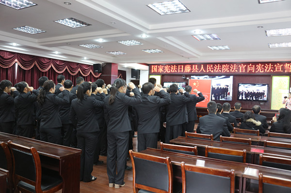 “我宣誓:忠于中华人民共和国宪法,维护宪法权威,履行法定职责,忠于祖国、忠于人民,恪尽职守、廉洁奉公,接受人民监督,为建设富强、民主、文明、和谐的社会主义国家努力奋斗!" 为弘扬宪法精神,增强法官的职业荣誉感,12月4日上午10时15分,藤县法院举行宣誓仪式,43名员额法官面对宪法立下铿锵誓言。