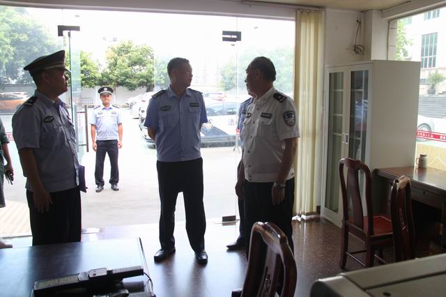 陆铭荣副总队长一行首先实地查看了藤县法院的安检设施、审判场所、监控中心、羁押室等警用设施配备,随后听取了法警大队杨翔大队长对藤县法院法警大队上半年的政治建警、协助机关安全保卫、警务保障、执法规范化建设、执法能力建设、警务信息化建设等情况的汇报,查看了相关的工作台账。