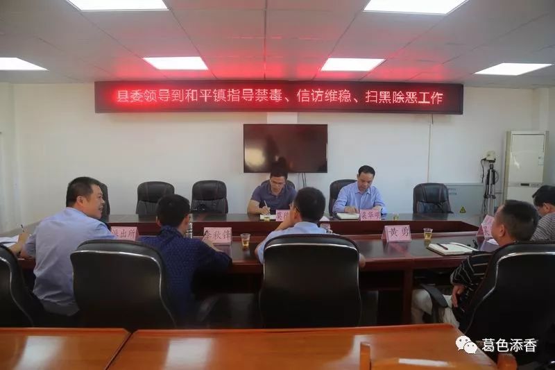11月2日下午,县委常委、政法委书记莫德锦到和平镇指导禁毒、信访维稳、扫黑除恶等工作并召开座谈会,县公安局党委副书记、政委梁华明陪同。和平镇党政主要领导、分管领导,派出所、司法所负责人等参加座谈会。