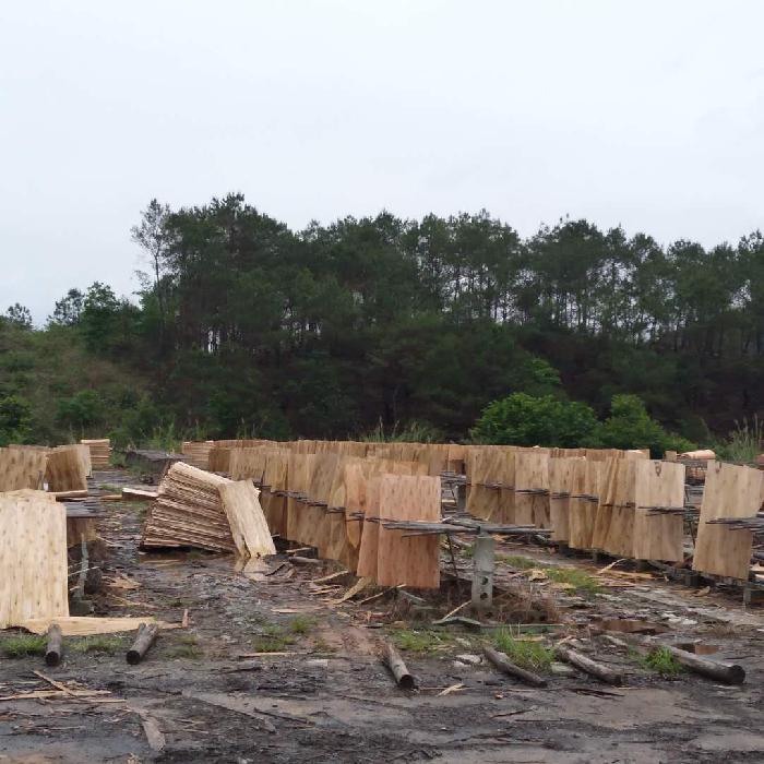 图为:木材厂在铁路沿线晒木片