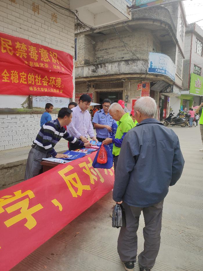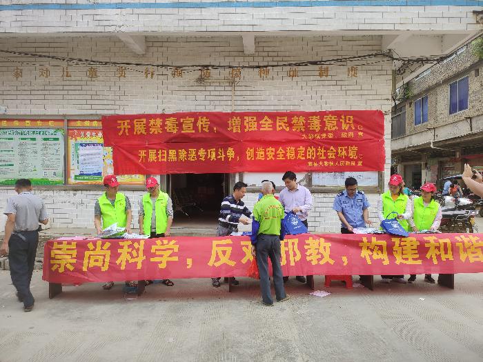 为进一步提高辖区群众禁毒、扫黑除恶、抵制邪教的思想认识,共建和谐稳定的社会环境。4月30日,大黎镇综治办联合镇司法所、派出所等部门,组织开展全民禁毒、反邪教等宣传活动。活动中,镇党委副书记、镇长苏有初,镇党委副书记、人大主席郭茂宗两位同志亲临活动现场,与现场工作人员一起向来往群众派发禁毒宣传简章和反邪教等宣传资料,以浅显易懂的方式向群众宣传禁毒、反邪教、扫黑除恶等相关知识,耐心讲解“什么是涉黑涉恶行为”“怎样预防沾染毒品”“如何抵制邪教侵害”等知识,让群众清楚认识到黑恶势力、毒品和邪教组织对自己、家人和社会的危害。并发动群众积极举报涉黑恶、涉毒、涉邪教活动信息,合力抵制铲除危害社会和谐稳定的不法因素,自觉加入到反邪教、禁毒的行动中来,对邪教要做到“不信、不听、不看、不传、不参与”。