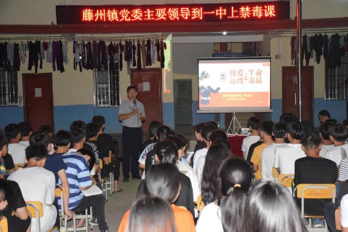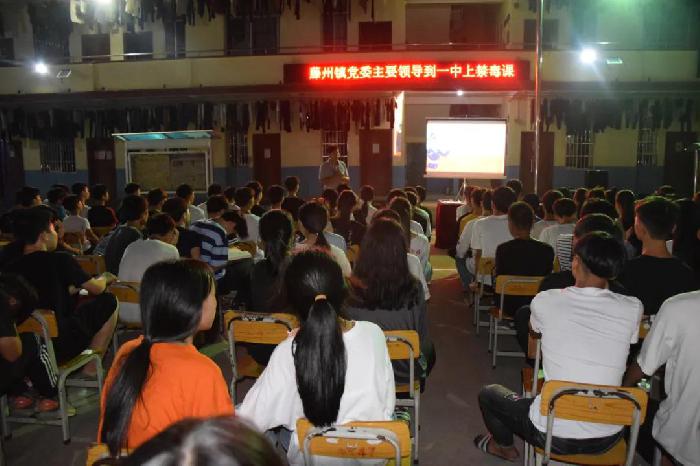6月30日晚上,藤州镇党委书记梁志庆继续走进校园,给即将完成九年义务教育的藤州镇一中九年级学生上禁毒教育课,寄语学生珍爱生命远离毒品,走出健康人生。