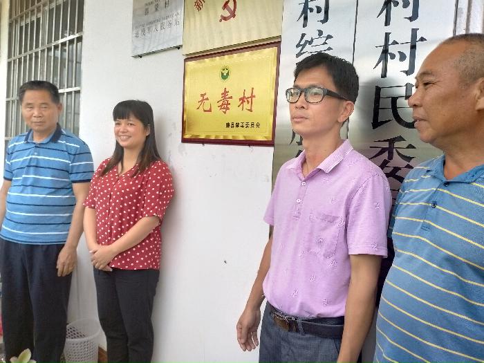 图为镇人大主席梁胜荣、副镇长陈筱瑜和都蒙村村干部在“无毒村”光荣牌前合影留念
