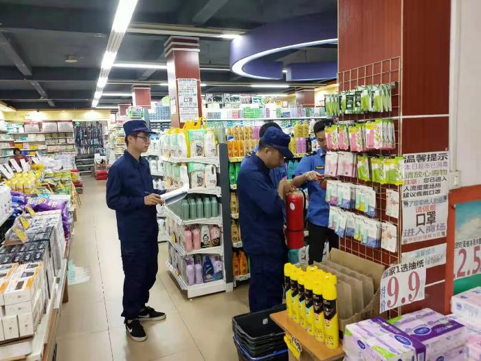 图为执法人员检查超市消防器材配备情况