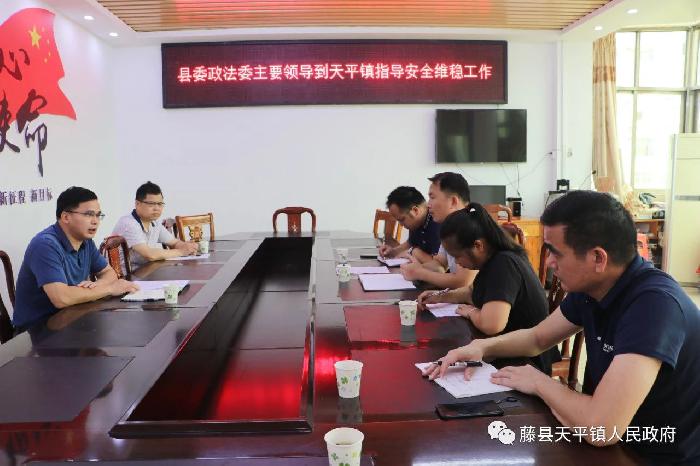 6月8日,县委政法委书记莫德锦到天平镇调研安全维稳、禁毒、反邪教等工作。天平镇党委书记陈金生陪同。