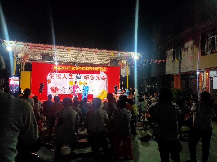 为进一步提升全民禁毒意识,深化全民禁毒宣传教育,做好我镇 2021 年“全民禁毒宣传月”禁毒宣传教育工作,广泛动员社会力量参与禁毒斗争,营造全社会参与禁毒的浓厚氛围。2021年7月8日晚上在杨村开展埌南镇2021年“全民禁毒宣传月”禁毒牛歌戏进村巡回演出活动。