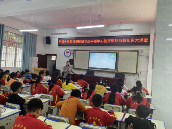 为深入开展防邪反邪警示宣传教育活动,进一步提高学生们的防邪反邪意识,营造浓厚的防范意识和反邪教宣传氛围,3月17日下午,平福乡党委书记匡翠华到平福中心校开展反邪教知识大讲堂。