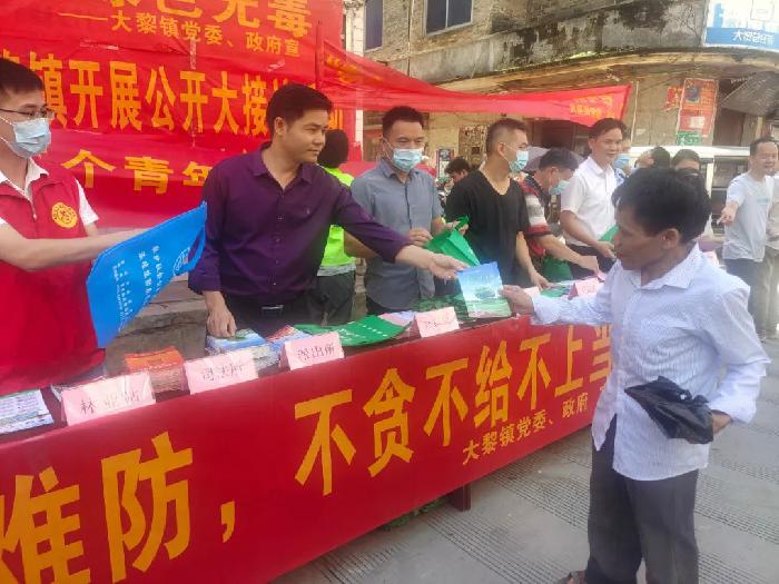 当天,大黎镇党委、政府组织了镇民政办、镇社保所、镇乡村建设中心、镇扶贫站、镇综治办、镇禁毒办等,会同大黎派出所、大黎司法所、大黎市场监督所、大黎卫生院、大黎财政所、大黎林业站、大黎农业推广站在大黎街开展“6.26”国际禁毒日宣传接访活动,向群众发放禁毒宣传、反邪教资料同时宣传禁毒宣传、反邪教知识等,并现场帮助群众安装反诈app。