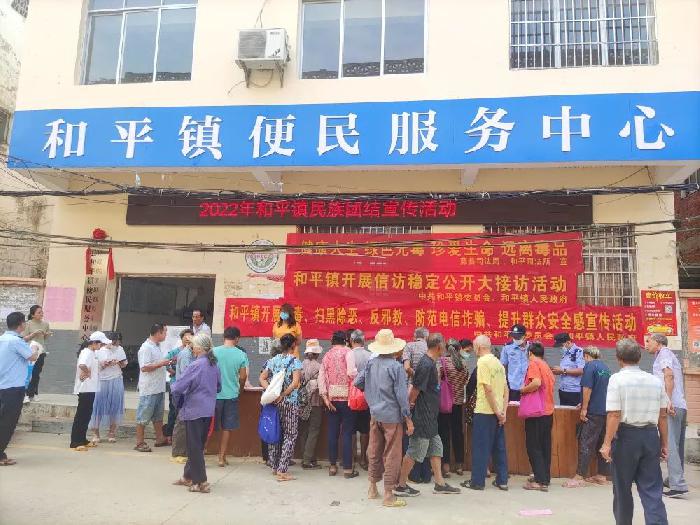 9月23日上午,和平镇组织镇综治中心、镇禁毒办、和平派出所、和平司法所、镇便民服务中心、镇市场监督管理所等职能部门在和平街开展镇领导大接访以及综治平安建设宣传,镇党委书记李秋锋参加了活动。