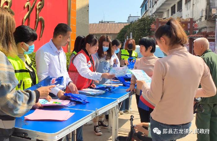 在政策宣传区,志愿者们在政府门口向群众发放社保医保、社会救助、群众安全感、禁毒、反邪教等宣传资料,为群众详细讲解相关政策法规,引导群众了解社保、医保,防控毒品、邪教及诈骗的知识,增强群众安全防范意识和法治观念,为平安古龙营造和谐稳定氛围。