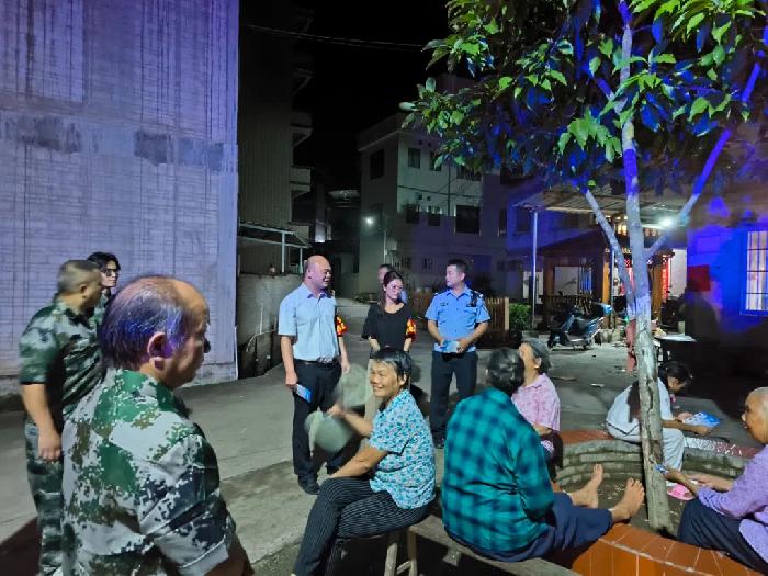 漆黑的夜晚警灯闪烁,照亮着巡逻队在村道巡逻和在村民茶余饭后集中点工作的身影。巡逻队采取步巡和车巡相结合的方式,向群众发放宣传单,与群众亲切交谈,向群众宣传平安建设、扫黑除恶、禁毒、抵制邪教、反电信诈骗、防盗等治安防范知识,同时排查消除隐患,严打震慑犯罪,让人民群众切实感受到安全就在身边。