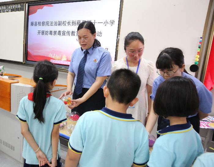 (通讯员:梁松梅)“同学们,你们知道国际禁毒日是哪一天吗?”“我知道,我知道,国际禁毒日是每年的6月26日。”在第38个国际禁毒日来临之际,为进一步增强青少年识毒、防毒、拒毒意识,2025年6月20日,藤县人民检察院检察委员会专职委员黄洁华以法治副校长的身份走进藤县第十一小学,以“清源护航,青春无毒”为主题,为师生们带去了一堂生动的法治课。