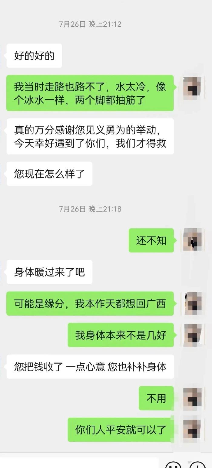 上岸后,关荣生拖着沉重的身体倒坐在岸边,直到确认两人暂无大碍,才松了口气。面对围观者的关切,他只是笑着说“没事”。当落水夫妇跪地感恩时,这位朴实的藤县村民轻声道:“都是缘分。”随后,双方换衣、互加微信,关荣生才得知落水的是一对夫妇。