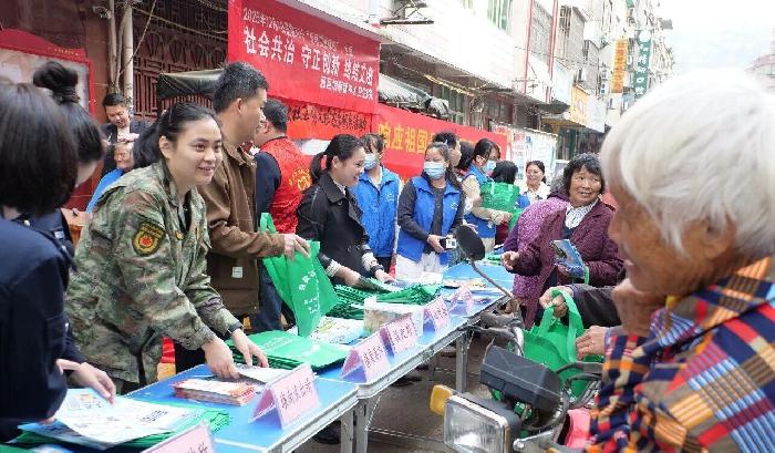 在宣传环节,工作人员通过悬挂横幅、发放手册、现场讲解等方式,系统开展了医保参保政策、健康知识、防艾宣传与普法教育。重点讲解了邪教与宗教的区别、邪教危害及防范方法,宣传了《中华人民共和国禁毒法》、新型毒品识别与危害,并结合扫黑除恶、反电诈、铁路护路、交通安全等内容进行普法。现场同步开展了征兵政策宣传,鼓励适龄青年积极响应国家号召,投身国防事业。