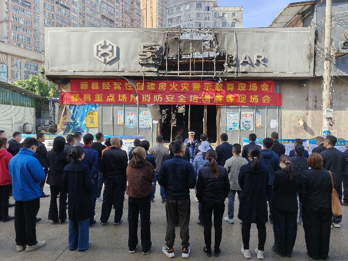 11月28日上午10时,为深刻汲取龙圩区“8·3”、藤县古龙镇“11·1”等典型亡人火灾教训,藤县消防救援大队组织召开经营性自建房火灾警示教育暨重点场所消防安全培训现场会,在当地一处酒吧火灾现场召开。